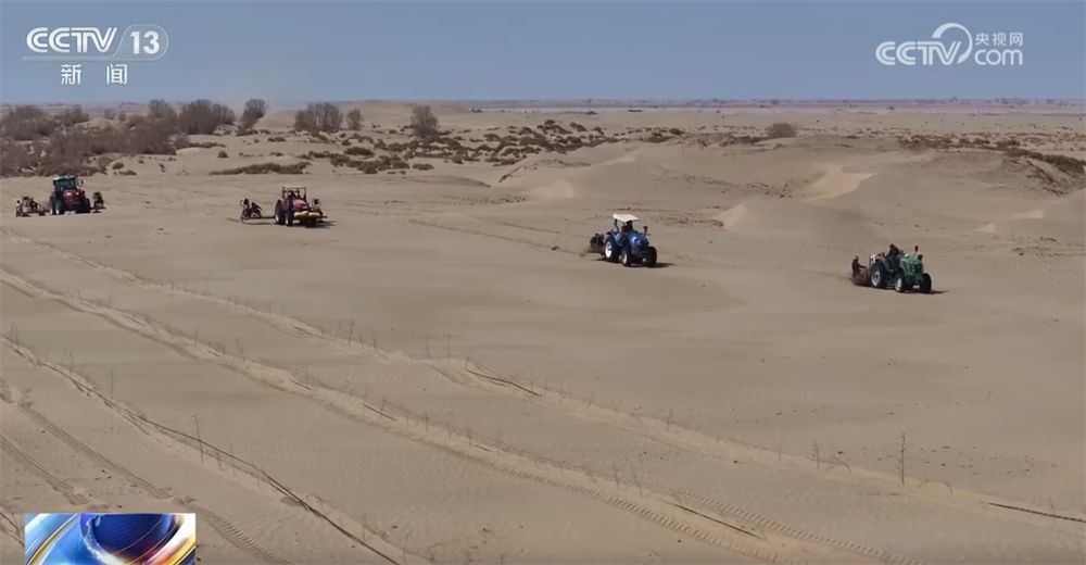 刚进四月,塔克拉玛干的正午就烈日炎炎。几台无人驾驶的种树机在北斗导航的指引下匀速前行,每一台机器走过,身后便留下一行笔直的树苗,两列树苗之间留出了五米宽的行距。