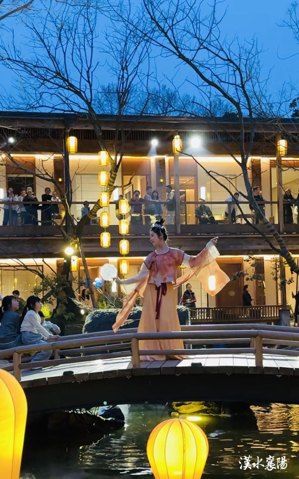 如今的襄阳院子,早已成为兼具颜值与内涵的文旅打卡地。园区不仅有沉浸式江南景致与地道美食,更精心打造了多元休闲体验场景:每天晚上,国风舞蹈、三国情景剧、武侠主题互动轮番上演,氛围感拉满;围炉煮茶区、晒秋打卡点等网红场景成功出圈,吸引市民和游客纷纷前来打卡留念。