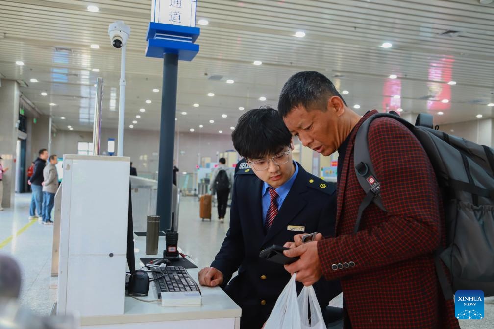 Passengers check in at Beijing South Railway Station in Beijing, capital of China, on April 6, 2026. An estimated 845.38 million passenger trips were made across China during the three-day Qingming Festival holiday, up 6 percent year on year, transportation authorities said on Monday.