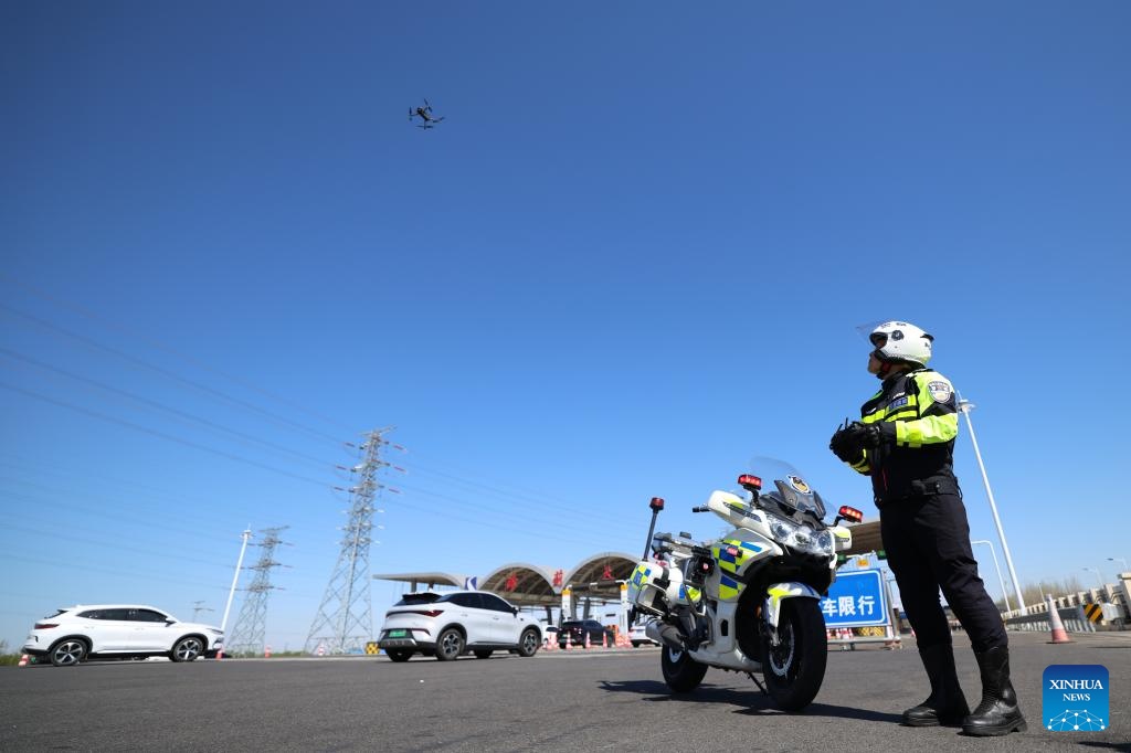 A traffic police operates a drone to conduct patrols at a toll station of an expressway in north China's Tianjin, April 6, 2026. An estimated 778.45 million road trips were made across China during the three-day Qingming Festival holiday, rising 5.8 percent from the same period last year, according to the Ministry of Transport. (Xinhua/Sun Fanyue)