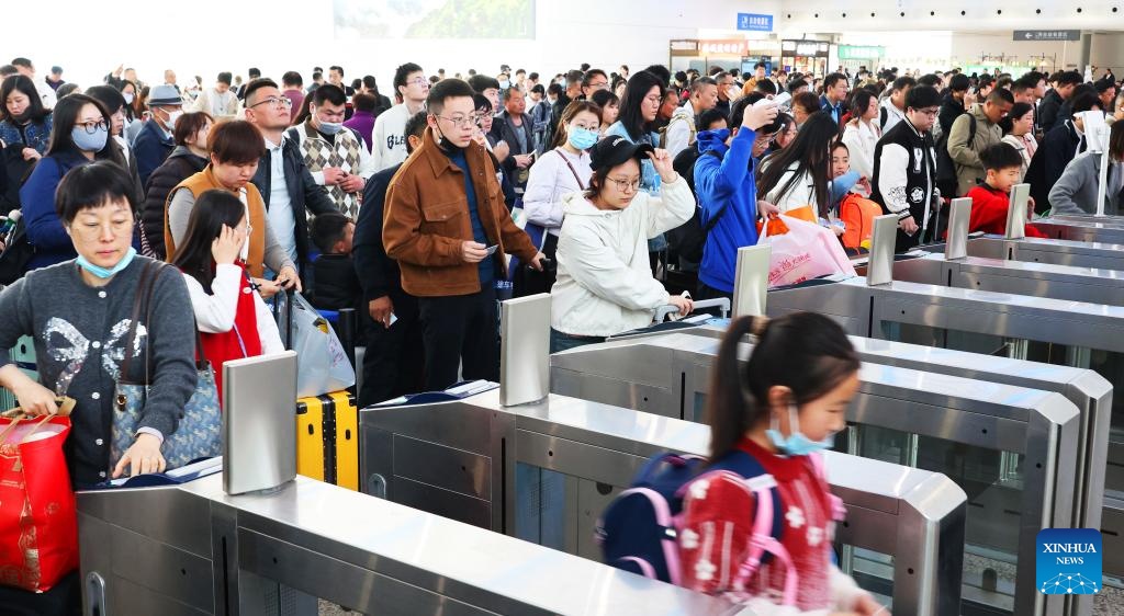 Passengers are pictured at Shanghai Hongqiao Railway Station in east China's Shanghai, on April 6, 2026. An estimated 845.38 million passenger trips were made across China during the three-day Qingming Festival holiday, up 6 percent year on year, transportation authorities said on Monday.