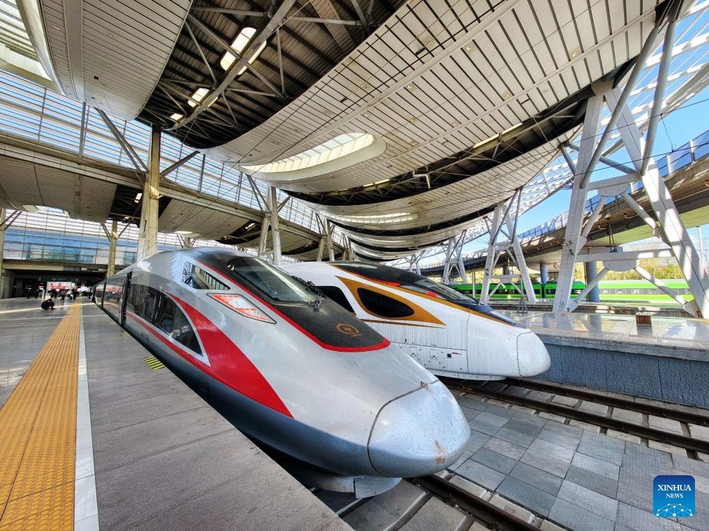 High-speed trains stop at Beijing South Railway Station in Beijing, capital of China, on April 6, 2026. An estimated 845.38 million passenger trips were made across China during the three-day Qingming Festival holiday, up 6 percent year on year, transportation authorities said on Monday.