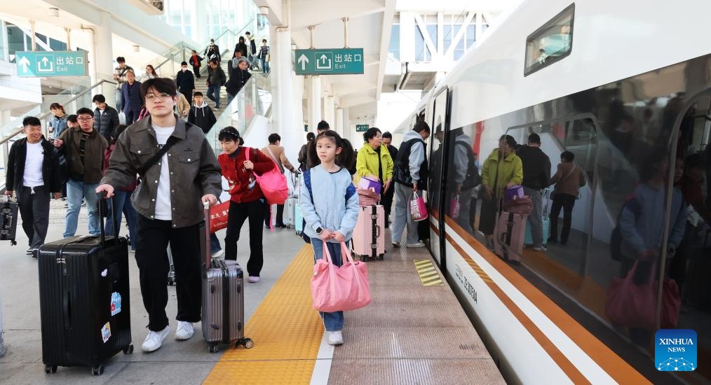 Passengers walk after getting off a train at Shanghai Hongqiao Railway Station in east China's Shanghai, on April 6, 2026. An estimated 845.38 million passenger trips were made across China during the three-day Qingming Festival holiday, up 6 percent year on year, transportation authorities said on Monday.