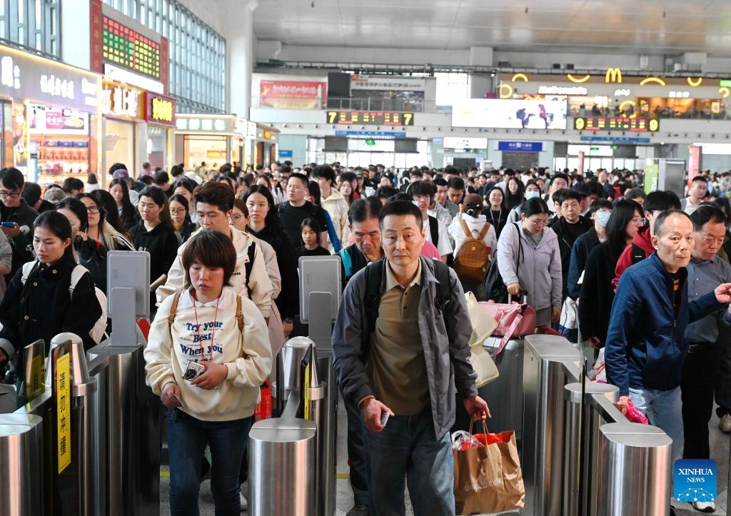 Passengers walk on the platform of Nanjing Railway Station in Nanjing City, east China's Jiangsu Province, on April 6, 2026. An estimated 845.38 million passenger trips were made across China during the three-day Qingming Festival holiday, up 6 percent year on year, transportation authorities said on Monday. The daily average number of trips reached 281.79 million, according to the Ministry of Transport. Road trips accounted for 778.45 million, rising 5.8 percent from the same period last year, while railway trips hit 57.68 million, up 8.2 percent year on year. (Photo by Yang Suping/Xinhua)