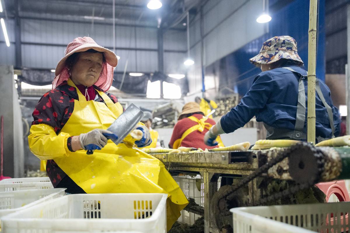 工人在流水线上处理竹笋。 (湖北日报全媒记者 夏晓君 摄)