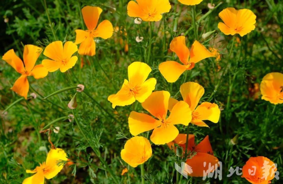 旁边的花菱草也不甘示弱,绚烂的橘黄色花浪翻涌,轻盈的花瓣折射着阳光,在春风中摇曳生姿。