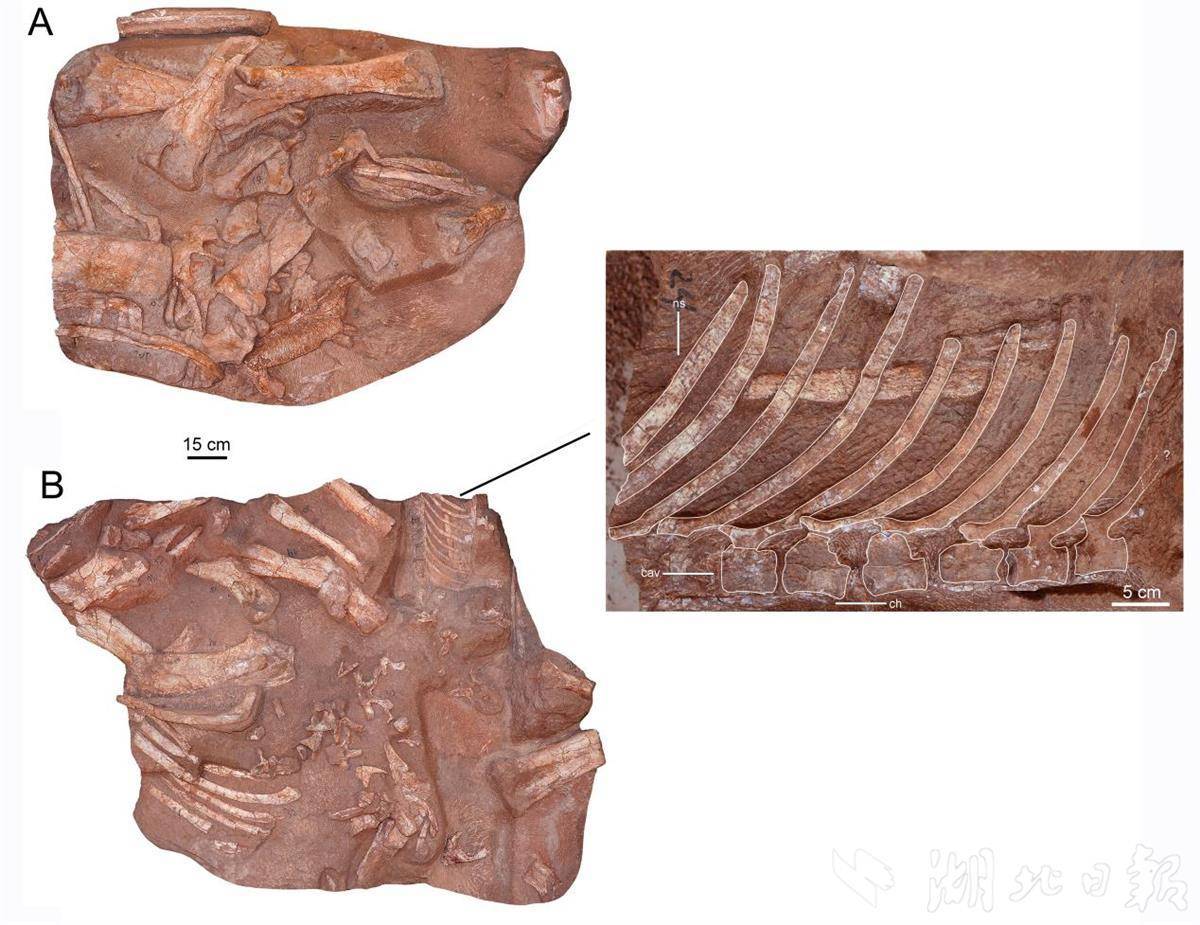 帆尾贡水龙骨骼标本(A,B)及特殊“帆尾”(右),采自赣州市章贡区。受访者供图