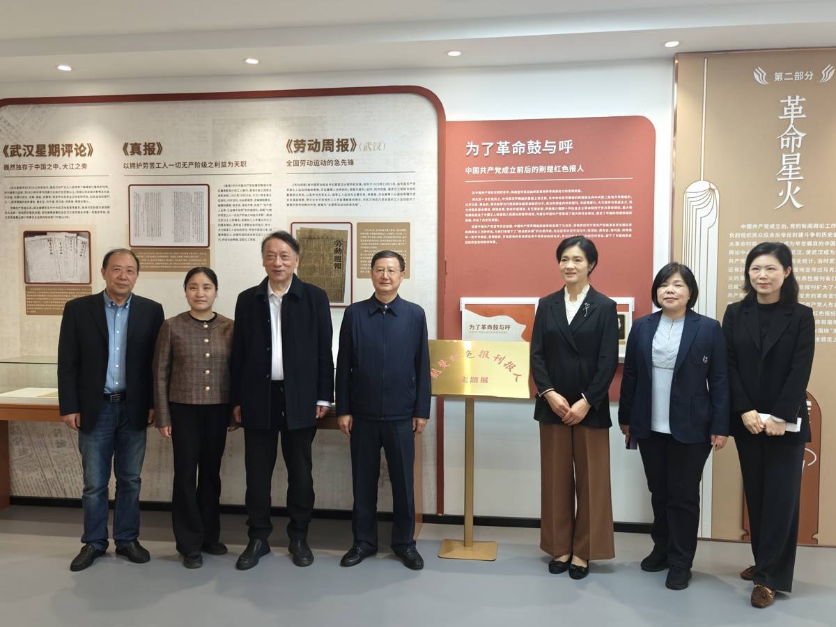 湖北省新闻工作者协会副主席张红艳、湖北省老新闻工作者协会会长方政军、湖北大学党委书记谢红星、副书记李莉,及校内相关职能部门、院系师生代表齐聚一堂,共同见证展厅揭牌的重要时刻。