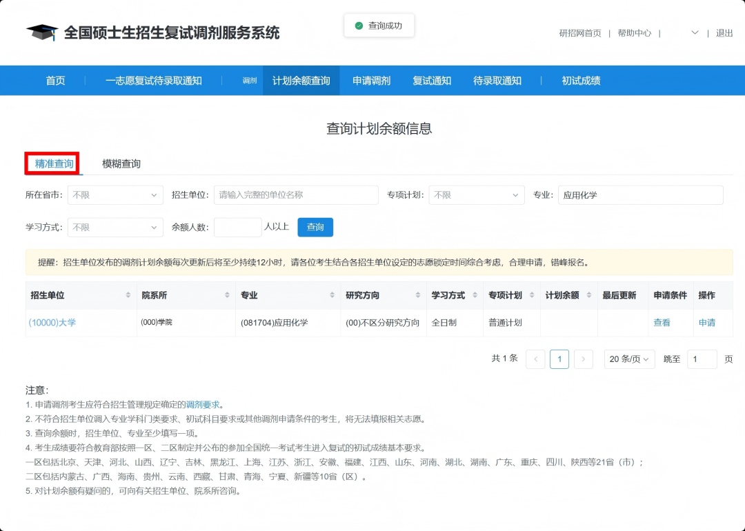 3.查询余额时,若使用精确查询,招生单位、专业至少填写一项;若使用模糊查询,必须选择所在省市与学科专业。