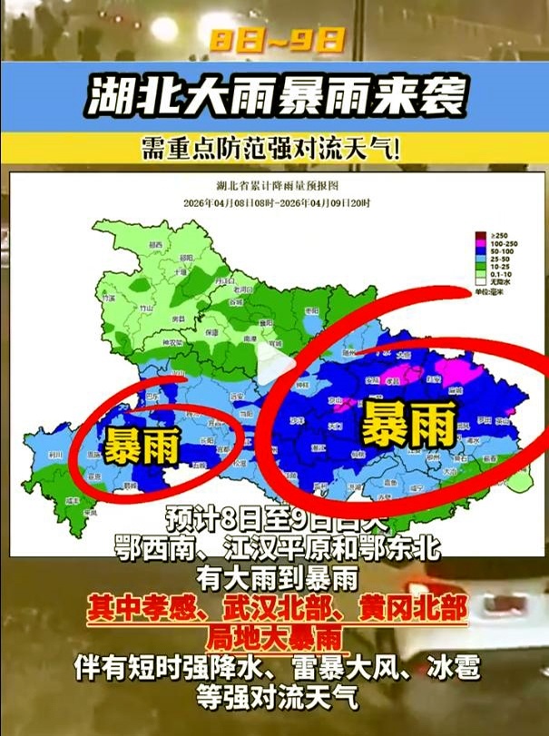 根据气象预报,8日至9日白天鄂西南、江汉平原和鄂东北有大雨到暴雨,鄂东北局地大暴雨,鄂东南中雨到大雨、局地暴雨,伴有强对流天气;强对流天气发生时,短时强降水小时雨强20~50毫米,雷暴大风8~11级,局地有冰雹。最强时段为8日傍晚至9日上午。