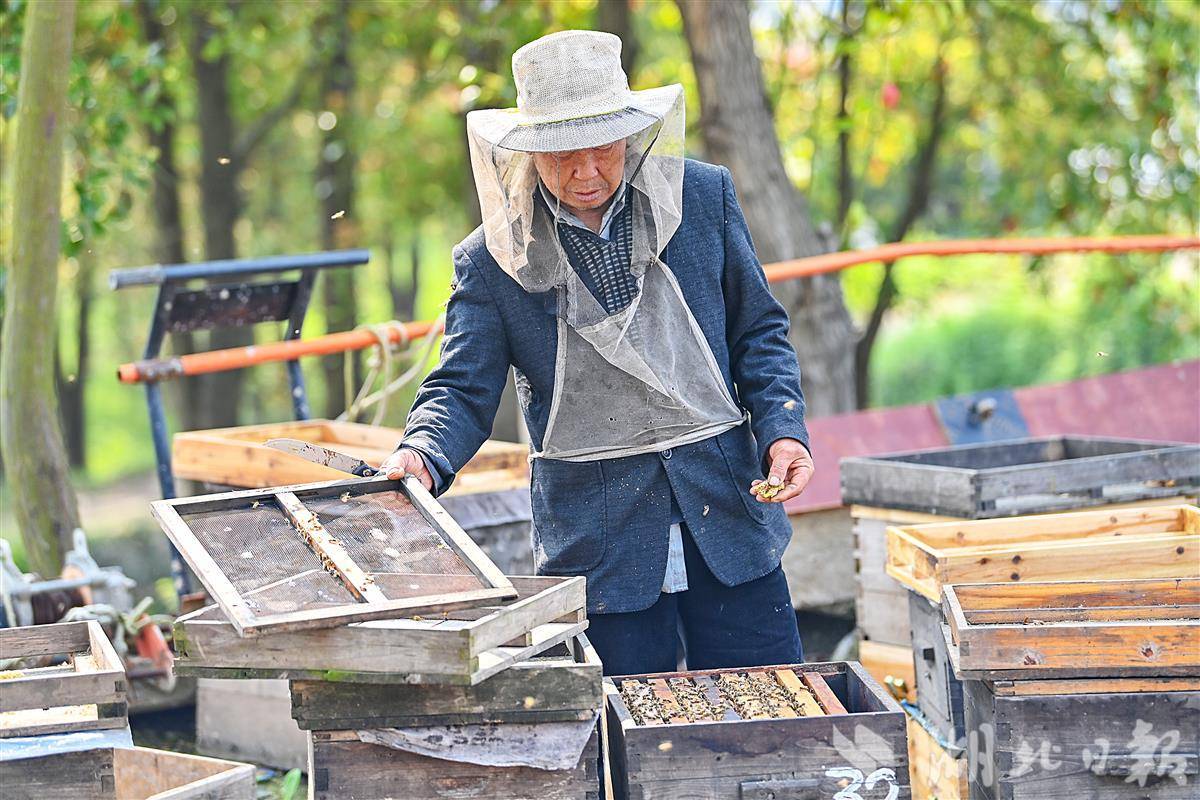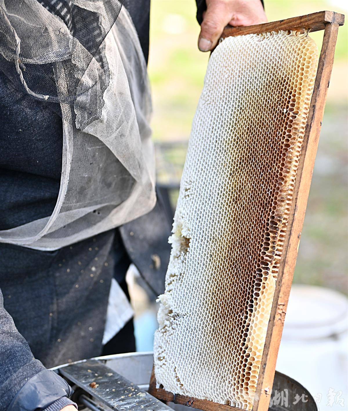 春蜜,是从2月下旬到5月下旬采收的蜂蜜。这个季节会有很多花种的蜜,比较典型的有刺槐蜜、紫云英蜜、油菜蜜、樱花蜜等。春蜜色彩缤纷,气味特别清香甘甜,质量上乘。(湖北日报全媒记者 朱熙勇 摄)