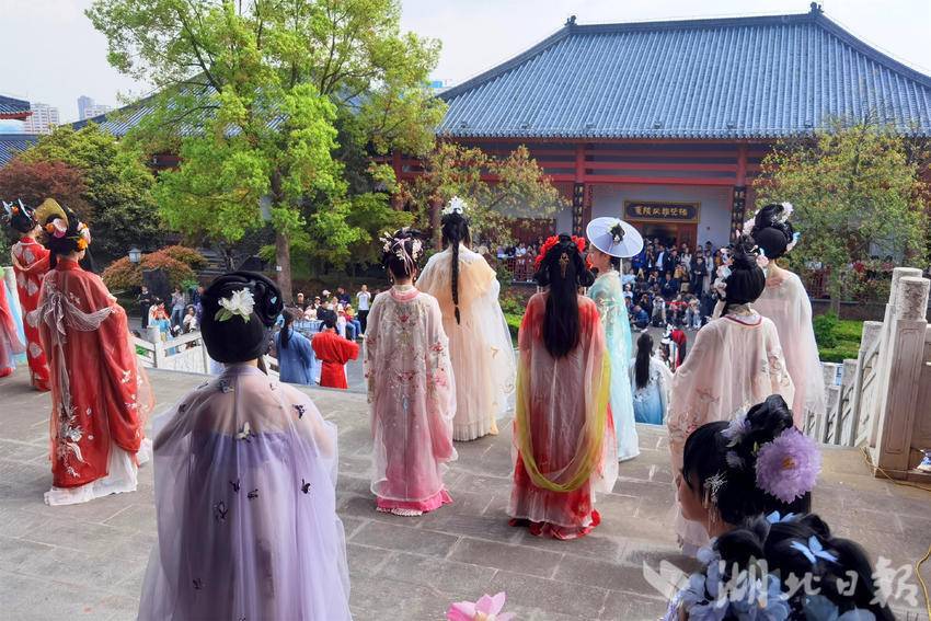 在汉服秀现场,600余名汉服爱好者身着华美服饰,穿行在夷陵楼古建筑群中。花仙子们在夷陵楼打卡春韵,共闹花朝盛事,共赏春日国风盛景。花神献瑞仪式中,十二名汉服花神代表传说中的十二月令花神,飘飘衣袂结合朵朵鲜花,为春天增色添彩,展现汉服的风采与韵味。
