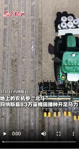 4月6日,玛纳斯县83万亩棉花全面进入播种期。在玛纳斯县北五岔镇魏家场村的万亩高标准棉田里,装有北斗导航系统的大马力拖拉机精准作业,一次性完成铺设滴灌带、覆膜、精量播种、覆土等多道工序,播行笔直、株距均匀,直线误差控制在2厘米以内,实现全程标准化、精细化作业。与传统播种方式相比,可节约棉种50%以上,提高土地利用率3%,并且方便后期机械化田间管理和采收。
