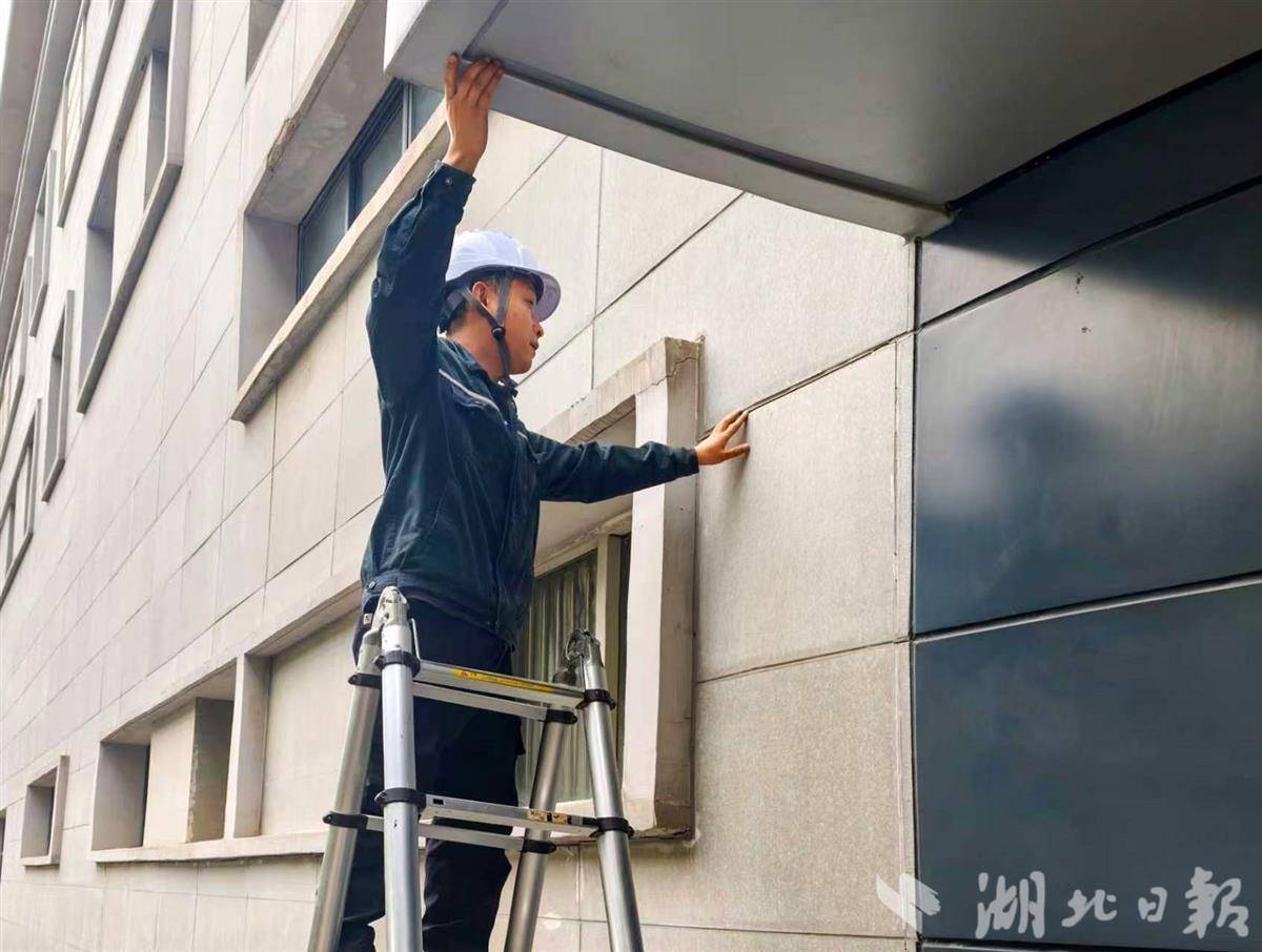 专业维修人员在1号线滠口新城站出入口检查外饰板(湖北日报通讯员张驰宇摄)