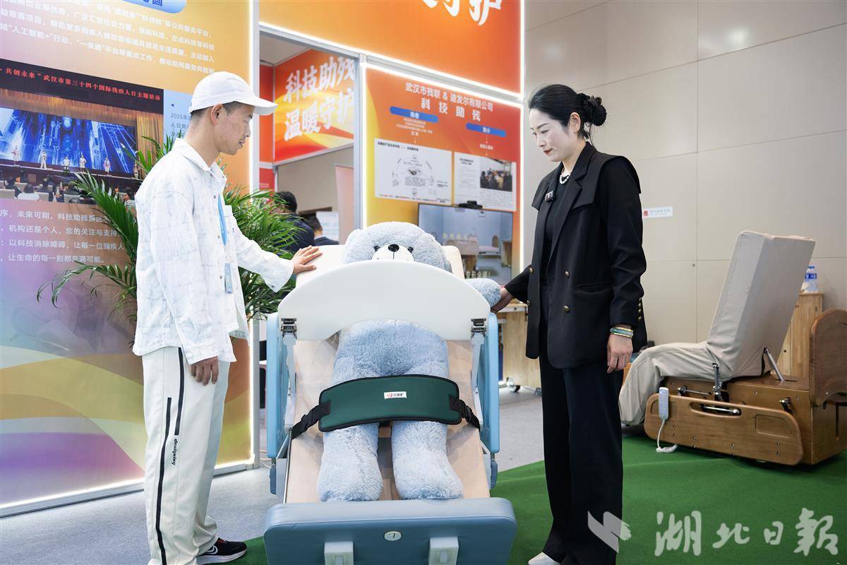 看似一张床,轻按开关,可实现一键坐起和左右侧翻身。4月8日,在2026(第八届)世界大健康博览会的迪发尔(武汉)智能科技有限公司展台,围满了观众。该公司市场总监陶延荣介绍,中重度脑瘫儿童的家庭护理一直是行业难题,针对这一特殊群体,公司研发了这套智能儿童床,方便失能儿童在日常护理中同步开展康复训练。(湖北日报全媒记者 任勇 魏铼 摄)