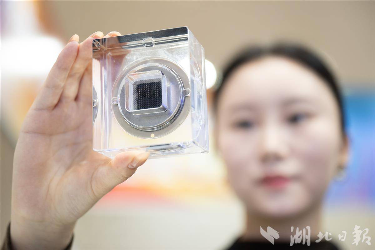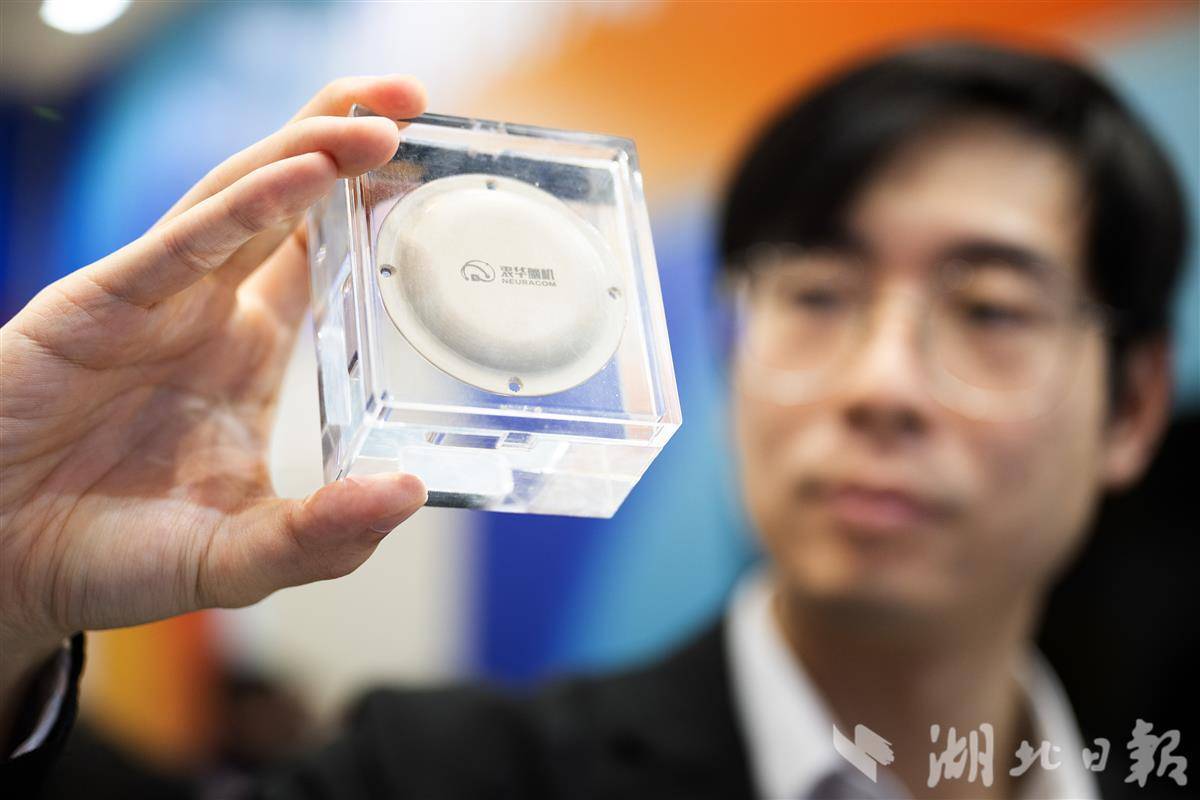 4月8日,在本届健博会首次增设的科技助残展区,衷华脑机展示的高通量植入式脑机接口。(湖北日报全媒记者 任勇 魏铼 摄)