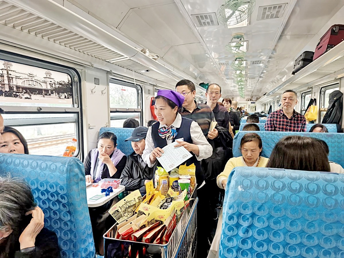 随后,复古的小推车很快出现在车厢里,“啤酒饮料矿泉水,瓜子花生八宝粥”的叫卖声再次响起,不少年轻的乘客表示:自己好像走进了精心装扮的一幕舞台剧,列车上的工作人员都仿若NPC,这种体验感十分奇特。