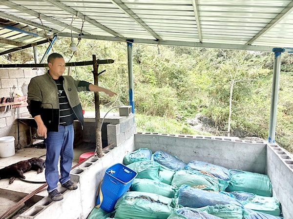 连日阴雨,通往养殖场的山路又湿又滑。12吨草料从外地运来,大车无法上山,需用小货车转运。那时陈刚的膝盖刚抽完积液,包着绷带,医生叮嘱至少休养两周。他不顾劝阻来到现场,艰难地爬上大货车,将草料一包包递到车下。陈忠勇和其他村民则在下面背运、码放。