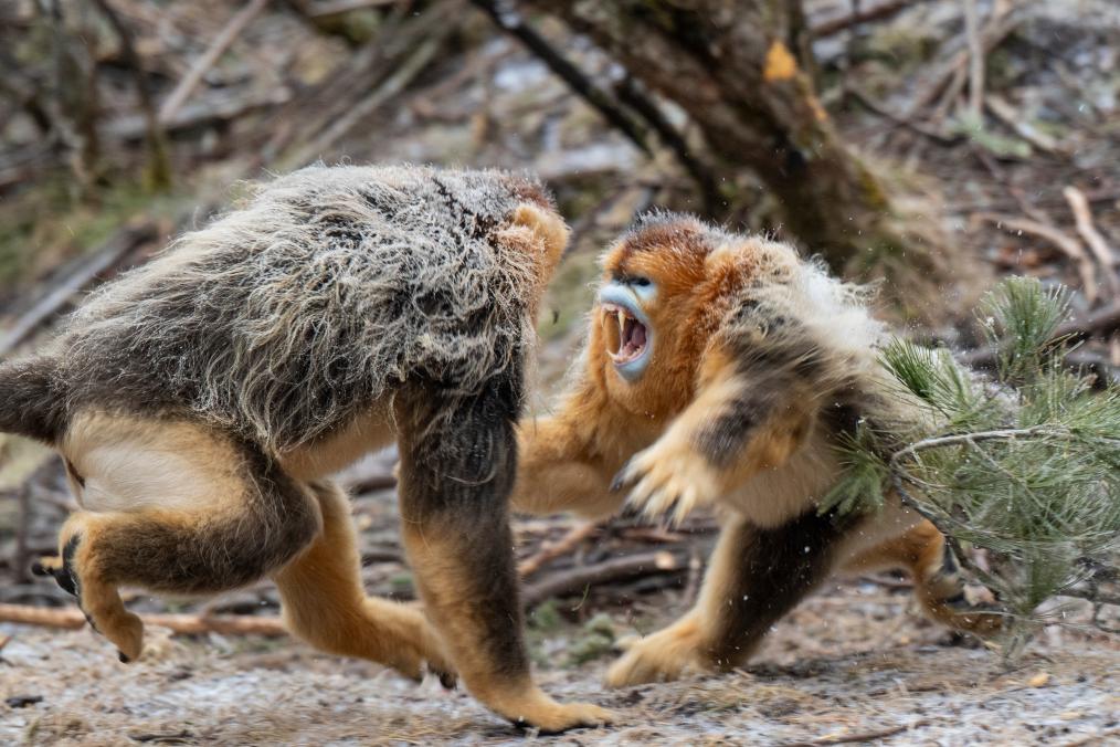 金丝猴在雪地里。新华社记者 伍志尊 摄
