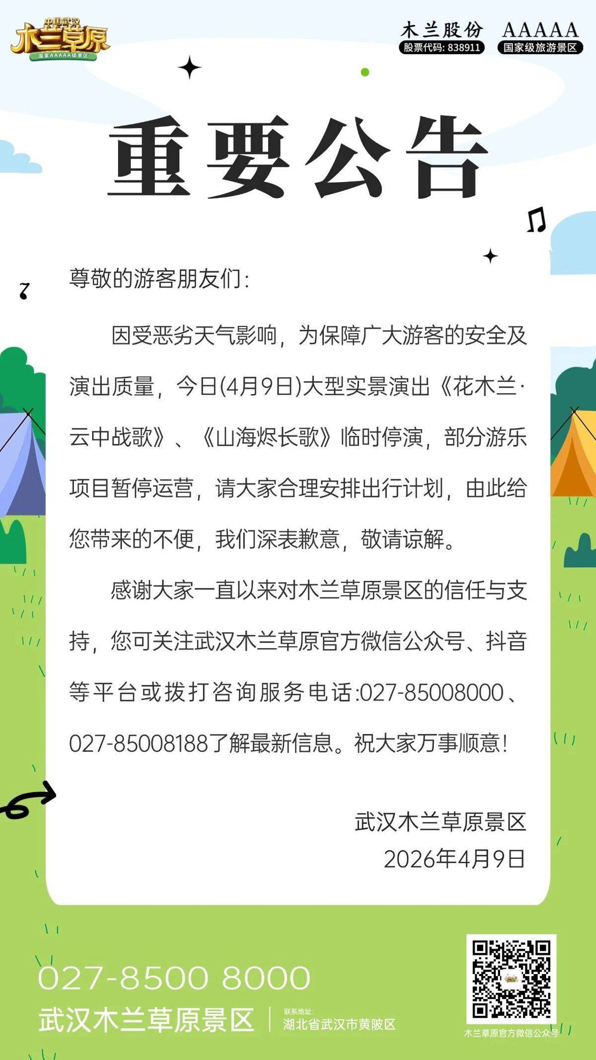 此外,4月9日,木兰草原大型实景演出《花木兰·云中战歌》《山海烬长歌》临时停演,部分游乐项目暂停运营,请大家合理安排出行计划。