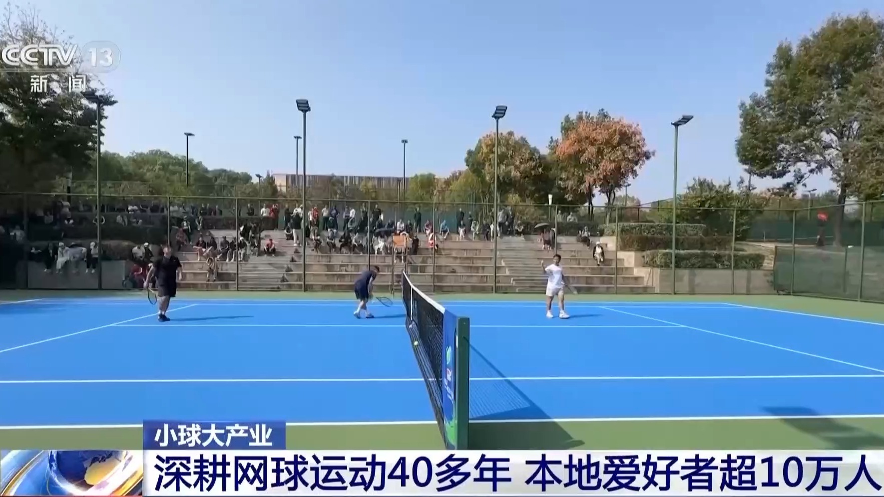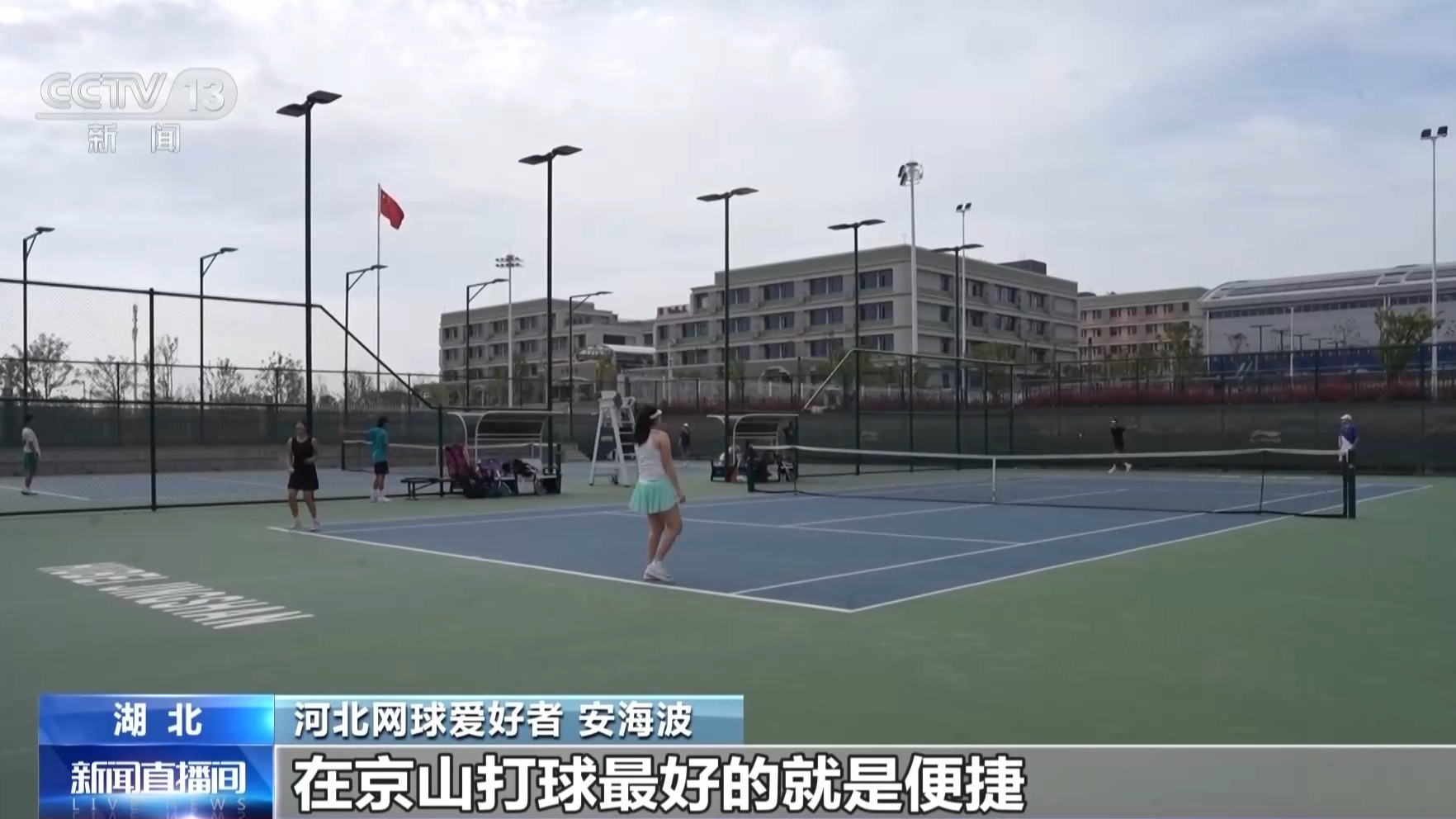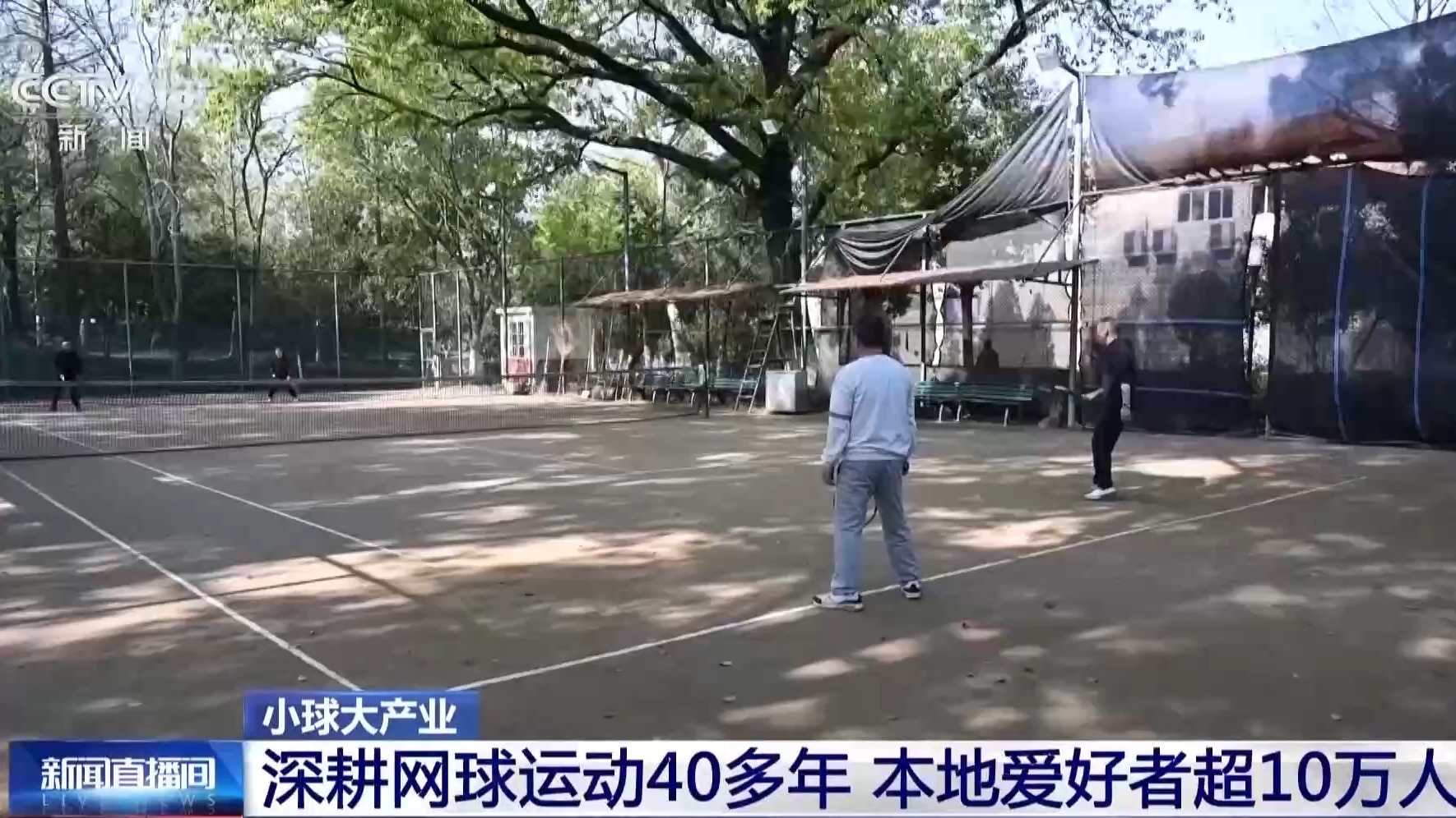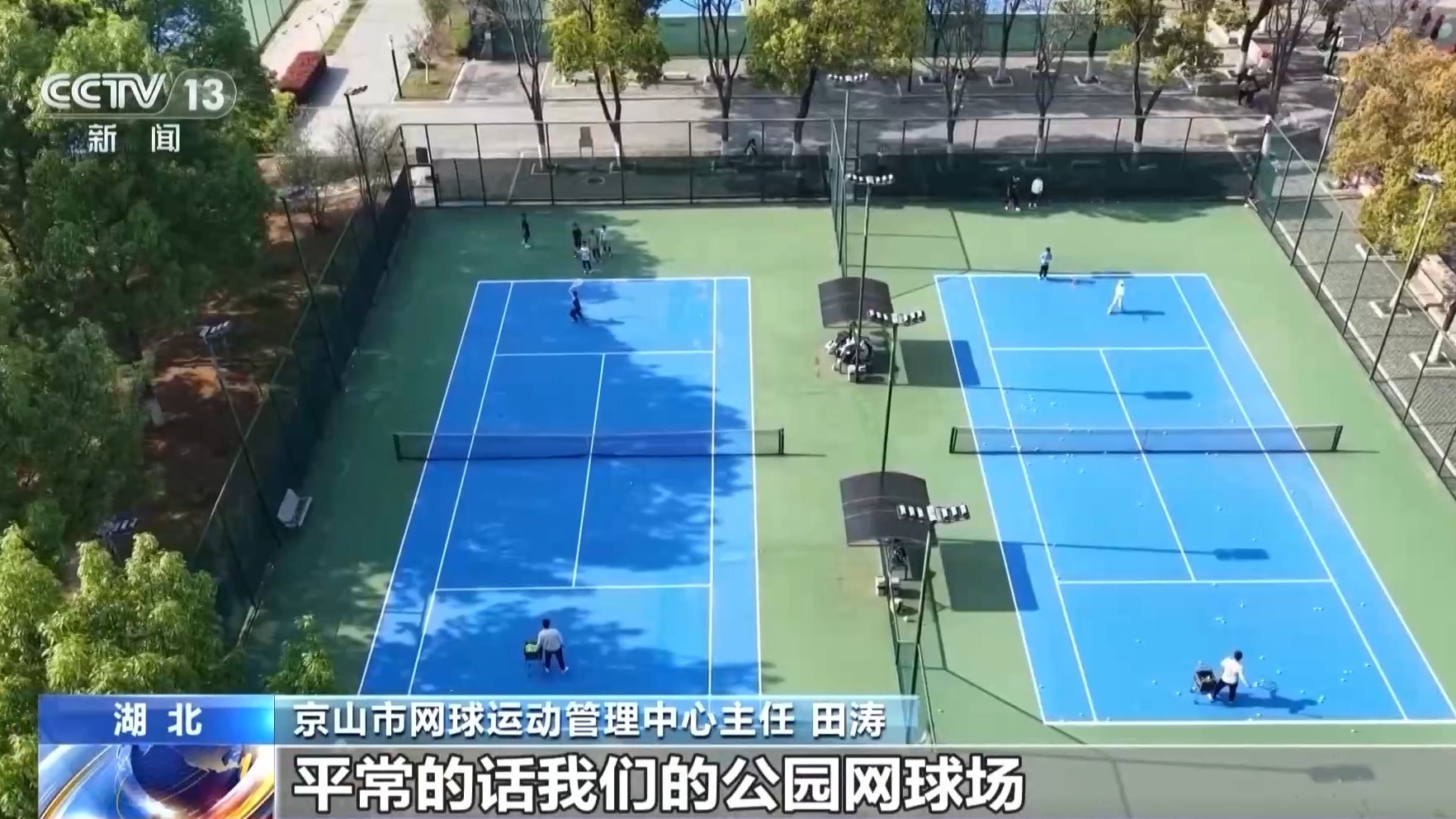 总台央视记者 杜思源:走在湖北京山的一座城市公园,随处都能听到网球的击球声。在这片公园里一共有15片标准化的网球场,它们在平时大多数时间都是免费向大众开放的。每天早上天刚亮,这里的网球比赛就开始了。