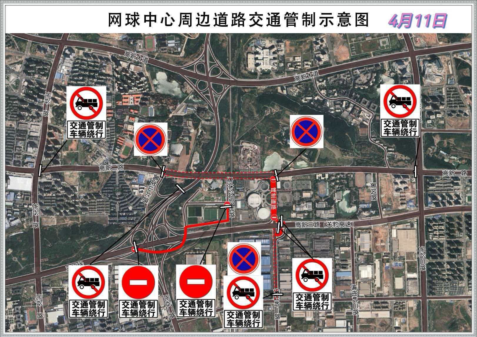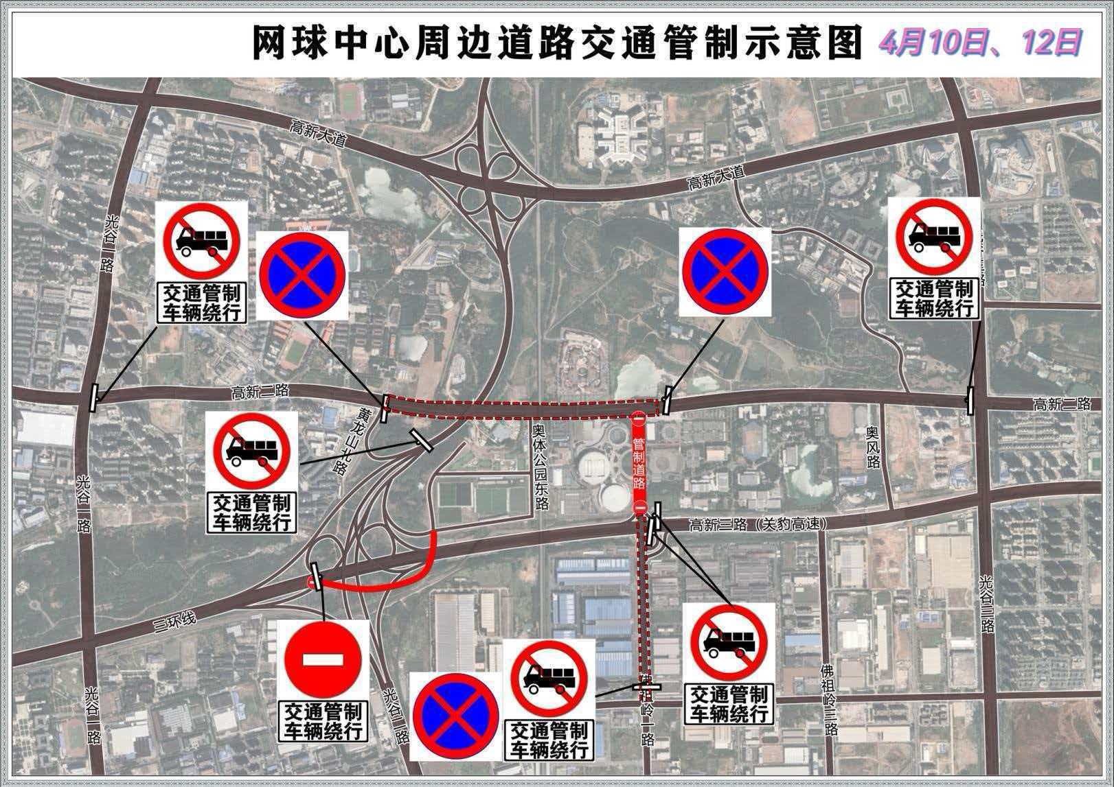 此外,高新二路(黄龙山北路至光谷三路)禁止货车通行;关豹高速佛祖岭一路立交往网球中心匝道、三环线高新二路出口匝道将采取临时交通管控,禁止车辆通行。
