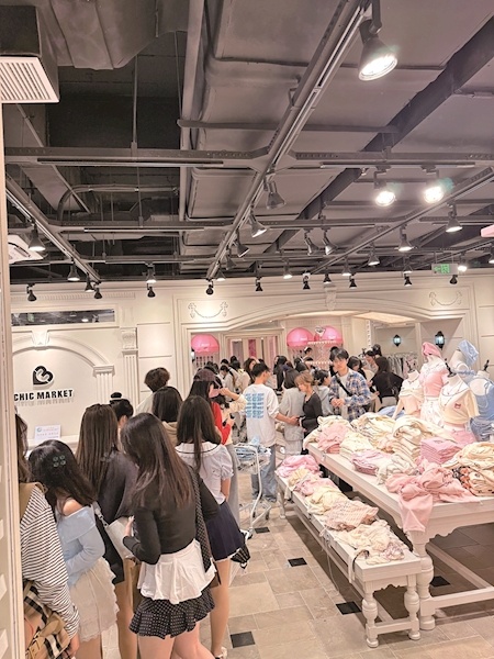 走进Chic Market武汉门店,粉白主调撞色黑边,甜酷气息扑面而来;按色分区的货架上,短款上衣、百褶裙、高腰裤整齐排列,人台模特身着美式复古辣妹装,混搭出青春张力。极目新闻记者在店内看到,结伴逛街的女学生、打卡拍照的年轻女孩络绎不绝,挑选、试穿、拍照分享的场景随处可见。