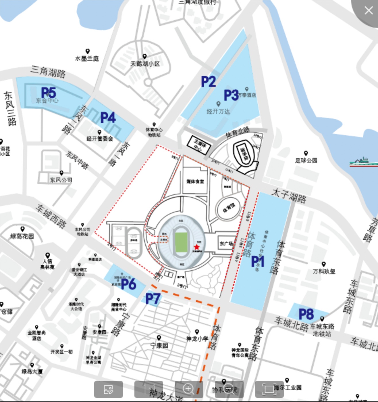 3.公交至东风大道三角湖路站,沿东风大道—太子湖路—体育路步行至体育中心4、5号门