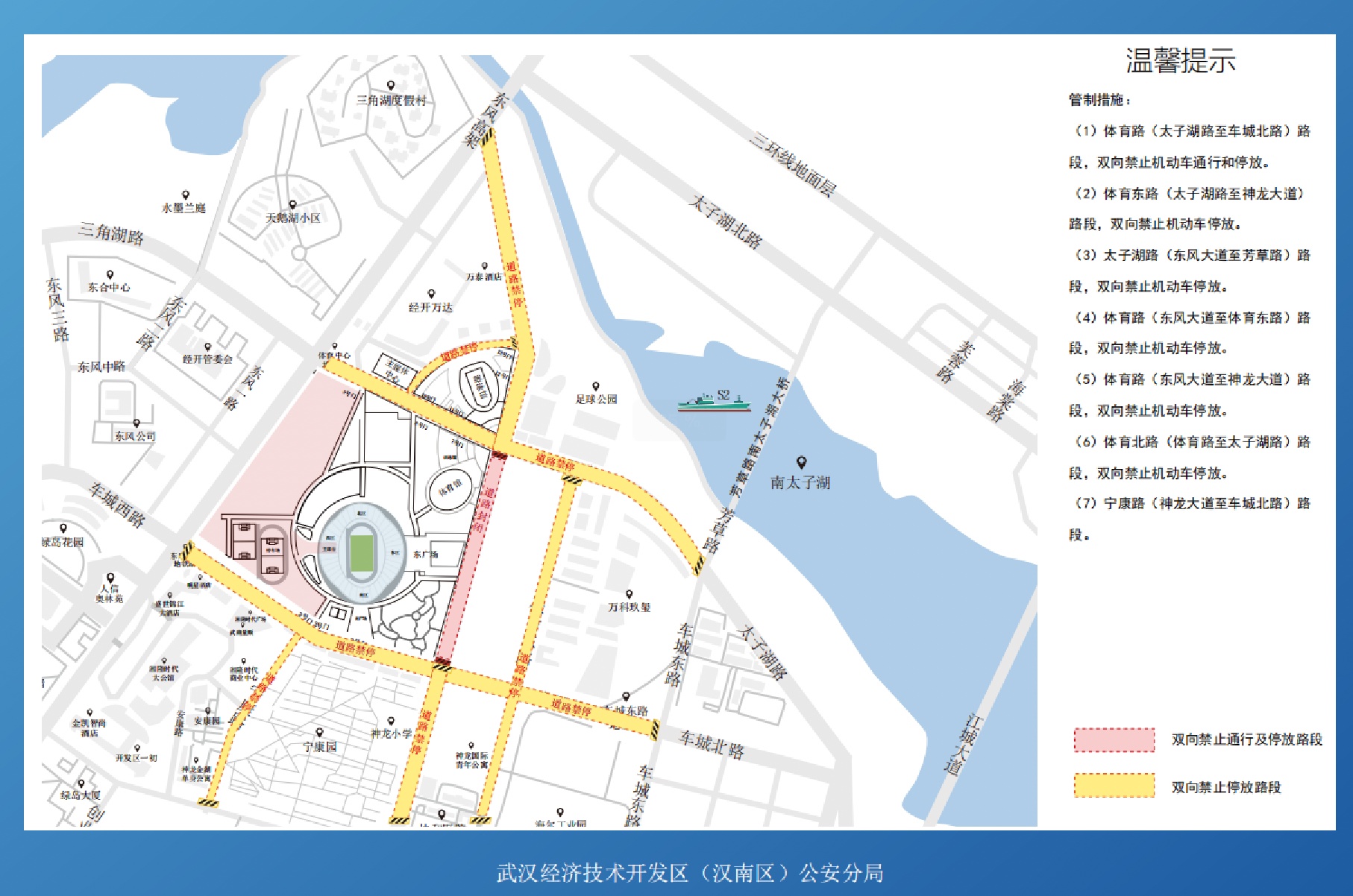 1.当日体育中心周边观众较多,车流量增大。前往该区域人员请尽量错峰出行,高峰时段提前规划路线,尽量避开体育路(东风大道至神龙大道)、太子湖路(东风大道至芳草路)、体育东路、车城北路(东风大道至车城东路)、宁康路等路段。需通行该区域的人员及车辆,可选择绕行神龙大道、沌阳大道、太子湖北路、江城大道等外围道路。