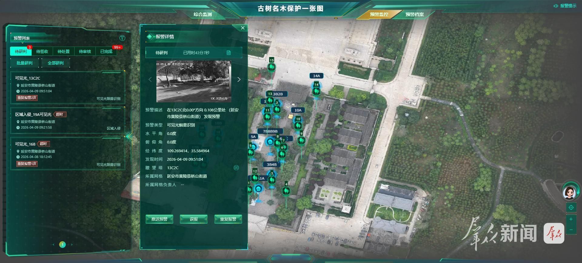 监控画面上,古柏的枝干、叶片清晰可见。平台记录显示,4月2日,监控镜头捕捉到3名游客跨越围栏靠近古柏,平台当即发出警报并同步景区,工作人员迅速到场劝导。
