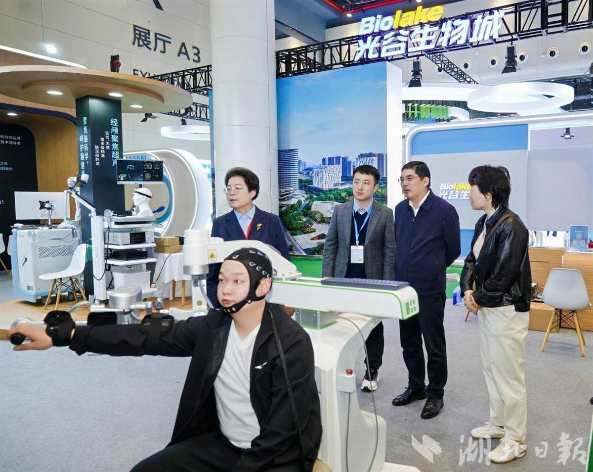 ——脑机接口成为最大焦点。武汉本土企业依瑞德展示“光电双模态”脑机接口康复系统,同步采集脑电与近红外信号,经AI融合解码,让患者凭“想象运动”驱动康复设备,为卒中、脊髓损伤患者打开主动康复新希望。全球首个非侵入式脑机接口二类器械持证者山东海天智能,官宣将建立华中研发总部,联手同济等医院共建脑机接口康复专科,剑指中国“脑谷”。