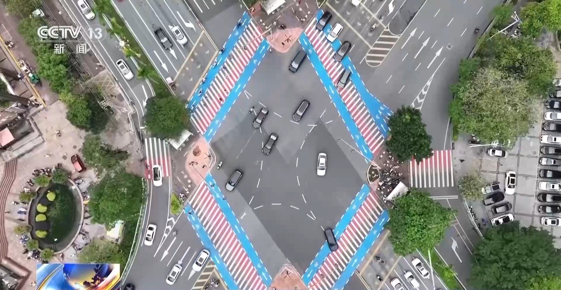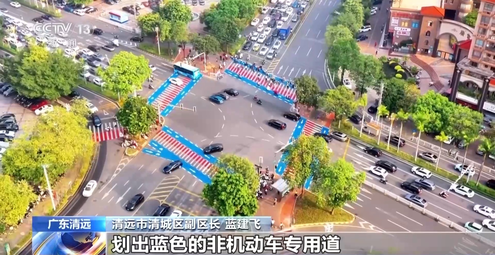 清远市清城区副区长 蓝建飞:在斑马线两侧划出蓝色的非机动车专用道,其次把安全岛的花坛移走,等候区扩大两到三倍,人车不再外溢到马路上,最后同步调整了红绿灯的配时。通过三个小调整,不动大手术,把路权理顺了,空间腾了出来,改造后早晚高峰期通行效率提升了50%以上,机动车平均等候时间缩短了一到两个信号灯周期。
