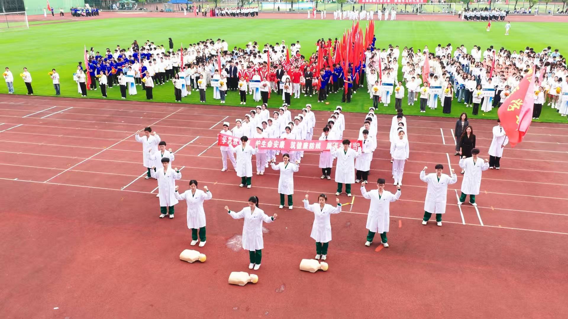伴随昂扬旋律,医学部方阵队列严整,学生们将心肺复苏三大核心步骤拆解、融入舞蹈编排。每一个按压的起伏、每一次手势的定格,都在用身体语言强调同一个信息:心脏骤停后的“黄金四分钟”至关重要,急救生命在与时间赛跑。原本生涩的医学要领在律动中变得直观又好记,不少观众边看边跟着比划。