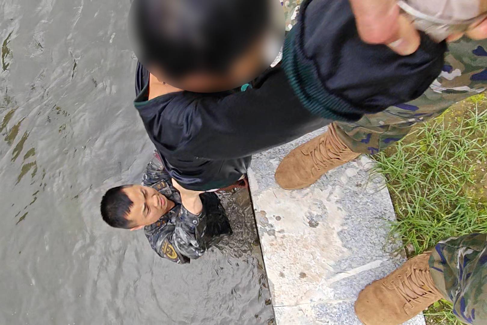 战士跳入河中,将女子拉回岸边。