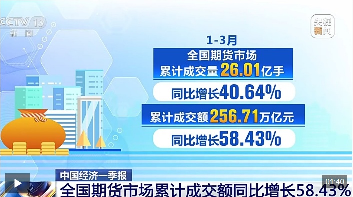 数据显示,1-3月全国期货市场累计成交量为26.01亿手,累计成交额为256.71万亿元,同比分别增长40.64%和58.43%。