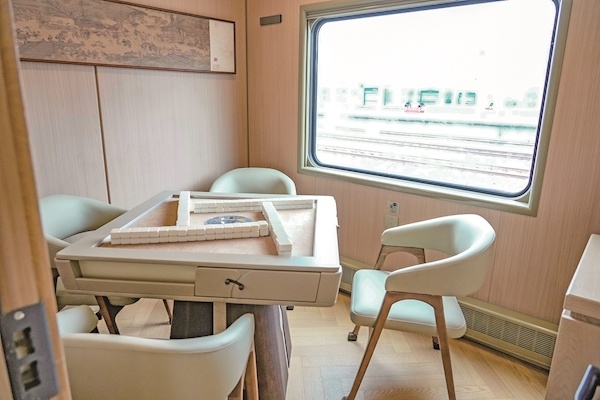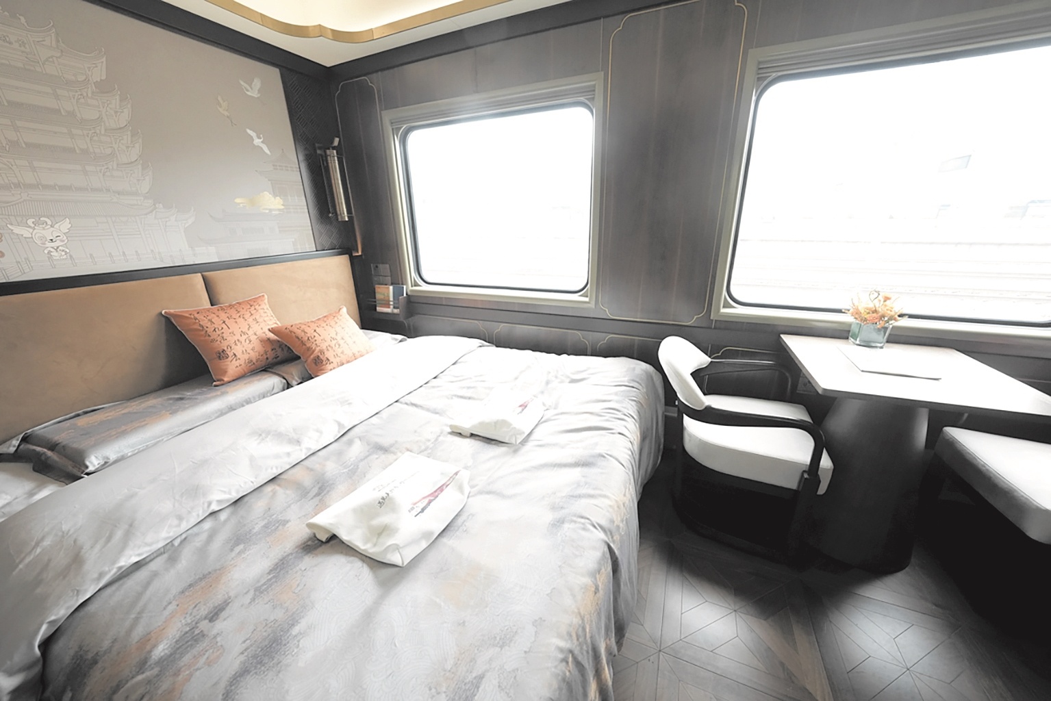 极目新闻记者登车看到,这趟全新的旅游专列是对传统老式绿皮车爆改而来,里里外外都再看不到普速列车的影子。与传统卧铺横在车厢内不同,这趟列车的所有床铺为纵向布局,也就是沿着车窗布设,更方便在床上观景,躺卧也更加舒适。车厢内设有大床房、双人间、三人亲子房(2下铺1上铺)、四人间(2下铺2上铺),每个包间均有独立卫浴。此外,车上还设有棋牌室、K歌房、茶室等多功能房间,配备明厨现炒的餐车,整个列车硬件设施堪比星级酒店。