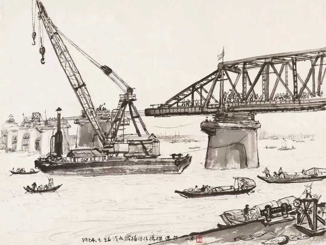 展览由“图史相彰”“图绘互嵌”“图闻知时”三个部分展开,将“最后一根钢梁”从艺术语言、建筑结构中抽离出来,以“时间的刻度”去观看,呈现图像与历史、图像与图像之间的关系,进而展现新中国工业发展的精神图谱与新时代的向新而行。在不动的建筑之后是不断流动的历史进程,从新中国特色社会主义经济建设的工业叙事到新时代文化叙事,武汉长江大桥所激发出的艺术创作无不交织在“带入国家情怀的抒写”和“带入生活温度的观察”之中,而“人民性”则是贯穿作品创作的主题。