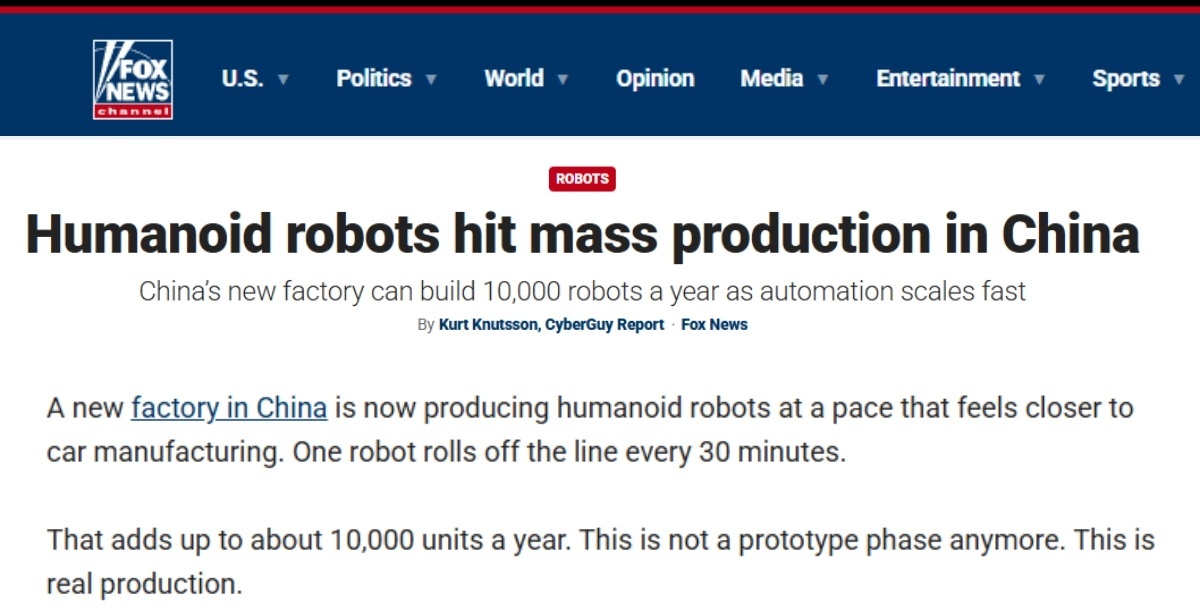 美国福克斯新闻网近日刊文称,随着自动化生产的快速规模化,中国的一家新工厂正以接近汽车制造的速度生产人形机器人——每30分钟就有一台机器人下线。这意味着年产量可达约一万台。文章感叹说,这不再只是原型阶段,而是真正的量产。