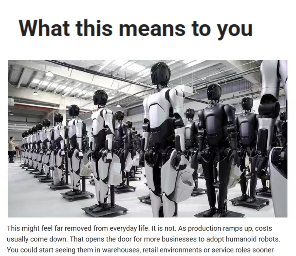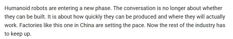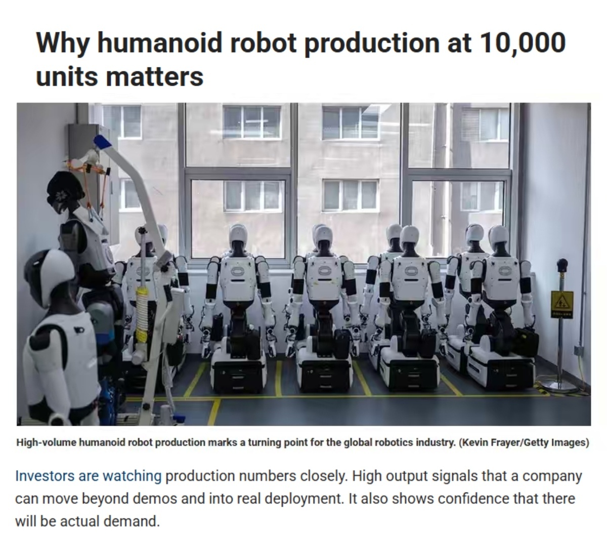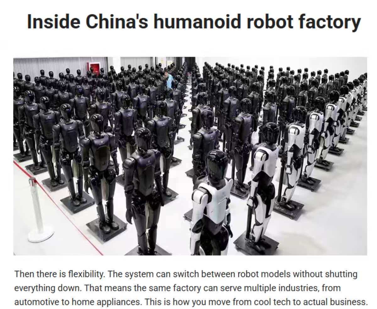 文章最后说,人形机器人正在进入一个新阶段:讨论的重点不再是它们能否被制造出来,而是能以多快的速度投入生产,以及究竟将在哪些岗位上投入实际应用。像中国这样的工厂正在引领潮流,行业的其他参与者现在必须跟上。