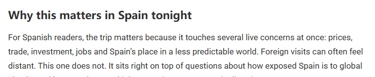 文章进一步分析说,近年来,西班牙积极寻求经济多元化、减少对传统市场依赖的新路径。像此次这样的高层访问已成为推进国家利益、寻找新合作伙伴的重要方式。文章认为,这些举措在竞争激烈的全球环境下,对西班牙的未来正变得尤为重要。