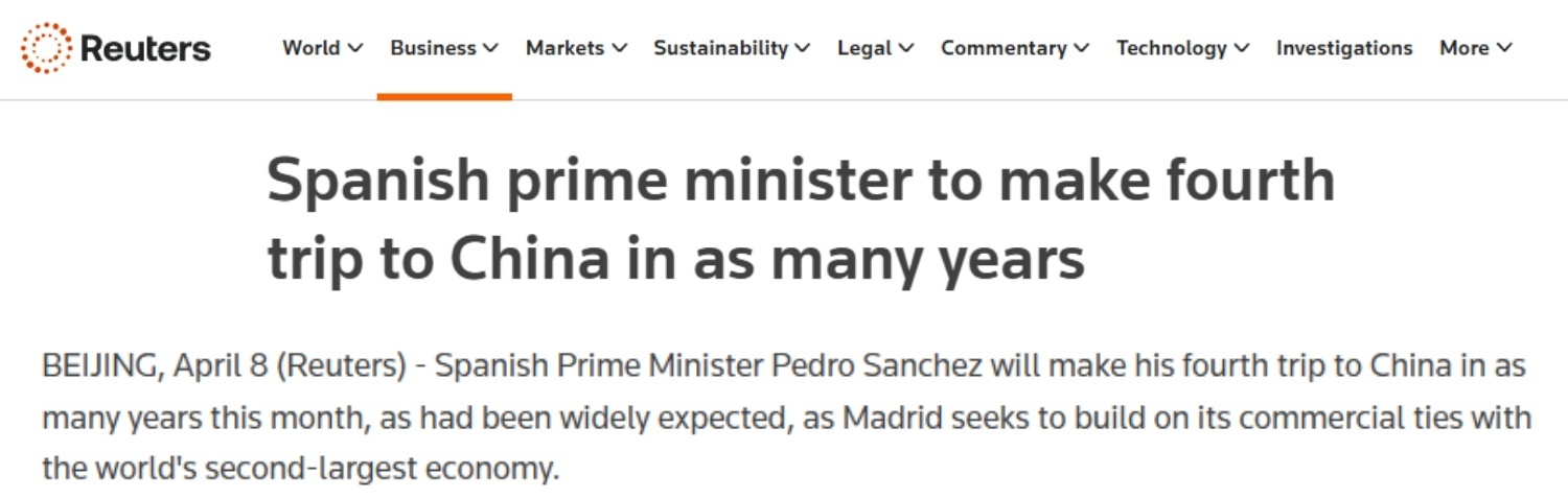 西班牙首相桑切斯4月11日至15日对中国进行正式访问。此访是桑切斯四年内第四次访华。多国媒体认为,此访将深化两国关系,其中经贸、科技等领域的合作将成为重要议题。