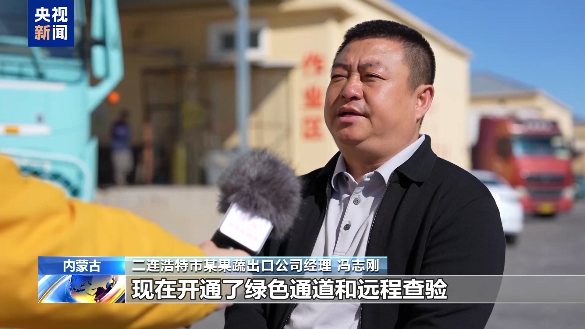 二连浩特市某果蔬出口公司经理 冯志刚:现在开通了绿色通道和远程查验,蔬菜直达就能快速查验放行,省时又省心。我们做蔬菜供应,配送效率高了很多,整体供应成本大概能降20% ,生意现在更好做了。