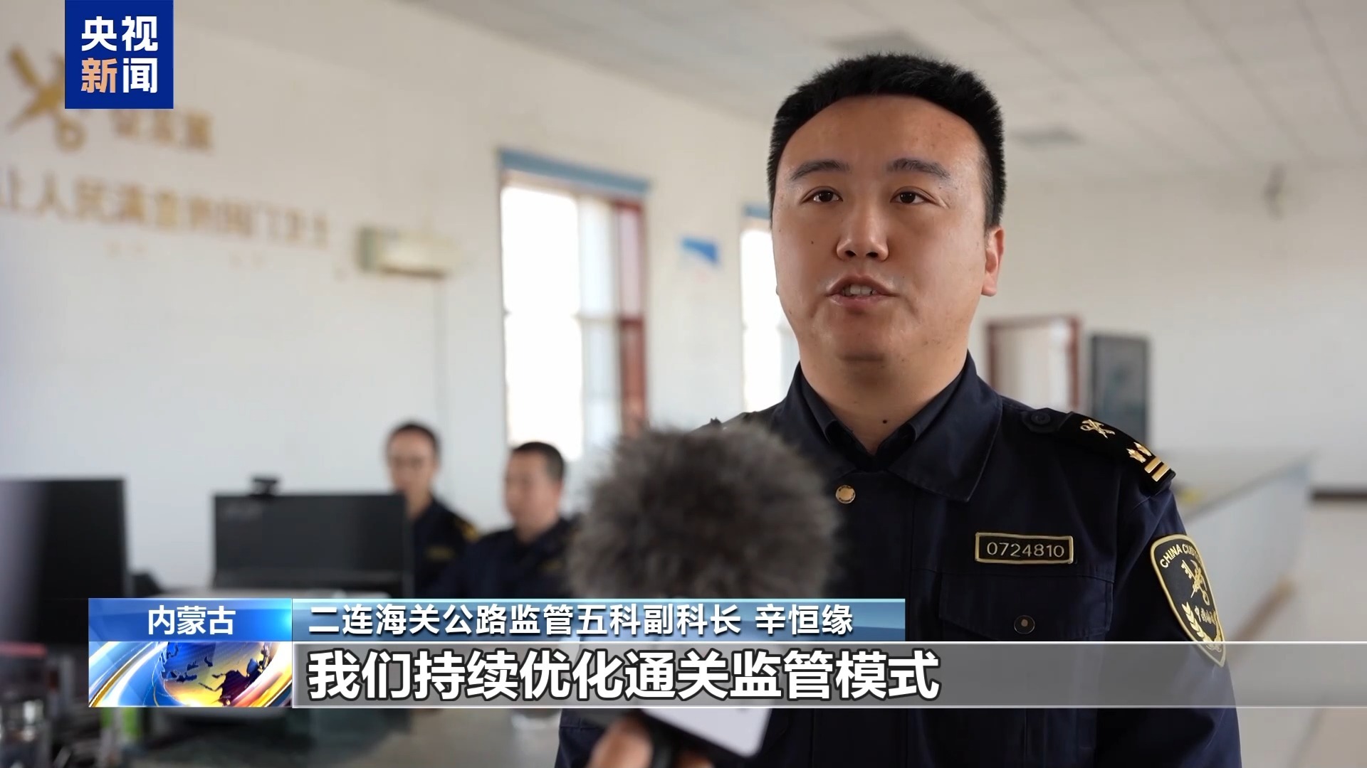 二连海关公路监管五科副科长 辛恒缘:依托自贸试验区政策优势,我们持续优化通关监管模式,深化智慧海关建设,推行“7×24小时”预约通关、铁路快通等便利措施,全力保障跨境物流链稳定畅通,服务地方高水平对外开放。