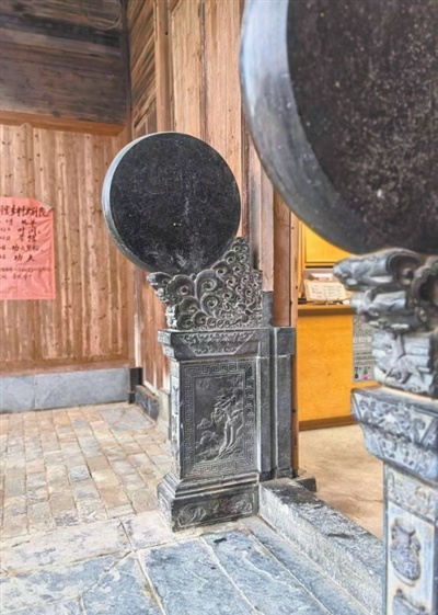 依然清楚地记得数年前,因为工作的缘故,我来到了南屏村。那天,我在村里迷了路,慌张穿过狭窄巷道时的回首一瞥,便是我和程氏宗祠的初见。祠堂大门紧闭,门口堆着一些杂物,但灰尘终究掩不住那对黟县青石雕刻而成的抱鼓石的光泽。由于黟县青石密度高、抗风化能力强,抱鼓石上的石雕历经岁月洗礼仍清晰可见。两侧石鼓分别由三龙腾云与五凤朝阳纹样托举,寓意“龙凤呈祥”,画面细腻流畅却不乏力量。两侧鼓座雕刻有包含山水、仙鹤、亭台、宝塔等元素的传统画片,使抱鼓石庄重且雅致。经年累月,抱鼓石越发黑亮、油润,仿佛在诉说着在它沉寂的那些年,有多少人在祠堂前驻足过、抚摸过、仰望过。