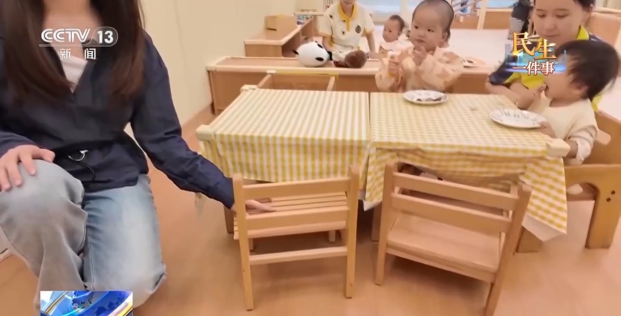 总台记者 武文璇:走入专门为0—1岁小朋友设置的乳儿班,可以看到很多贴心的细节。在我右手边的操作台上,配备着专门进行消杀的消毒柜。看这里,在园内,像这样的桌子和柜子都贴着防磕碰的海绵。连小朋友吃饭的椅子,它的造型和高度都是为不同月龄的小朋友而设计的。