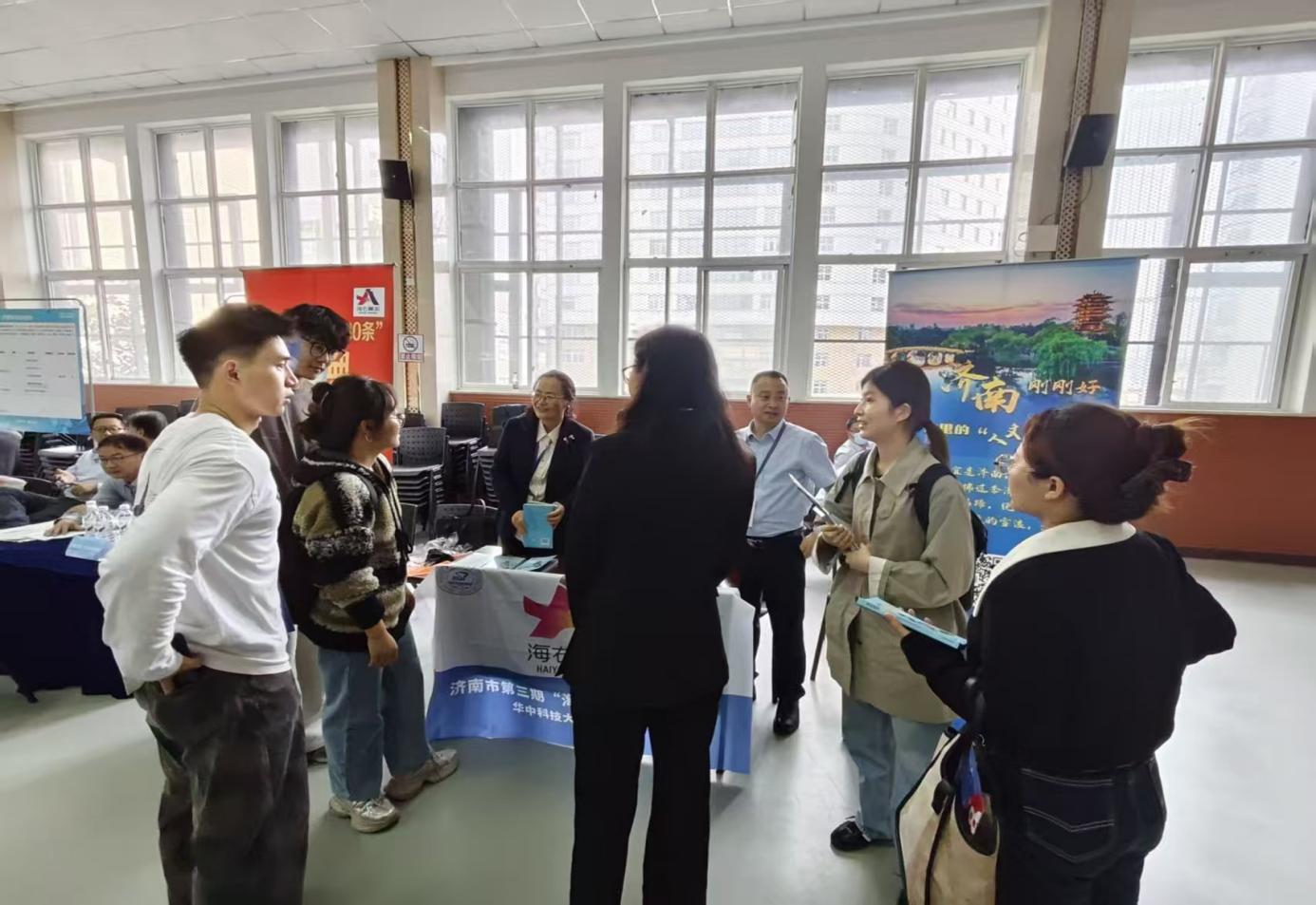 作为济南市“项目人才工作”的“招引员”与城市形象的“推介员”,华科大菁英五班学员早在3月下旬便主动对接学校资源,全力保障本次专场招聘活动。座谈会上,学员们向校方赠送了《我在济南刚刚好》《济南市人才政策30条》等济南城市宣介与政策读本,生动展现济南“天下泉城、人来无忧”的全周期人才服务生态。当天下午举办的专场校招双选会上,学员们现场担当“引才大使”,为宜居济南代言,细致解读济南人才政策“双30条”及青年人才“衣食住行”全链条支持措施,与来自华中科技大学、武汉大学等多所高校的毕业生面对面沟通,协助济南市各大医疗卫生机构精准揽才,实现人才链与产业链的同频共振。