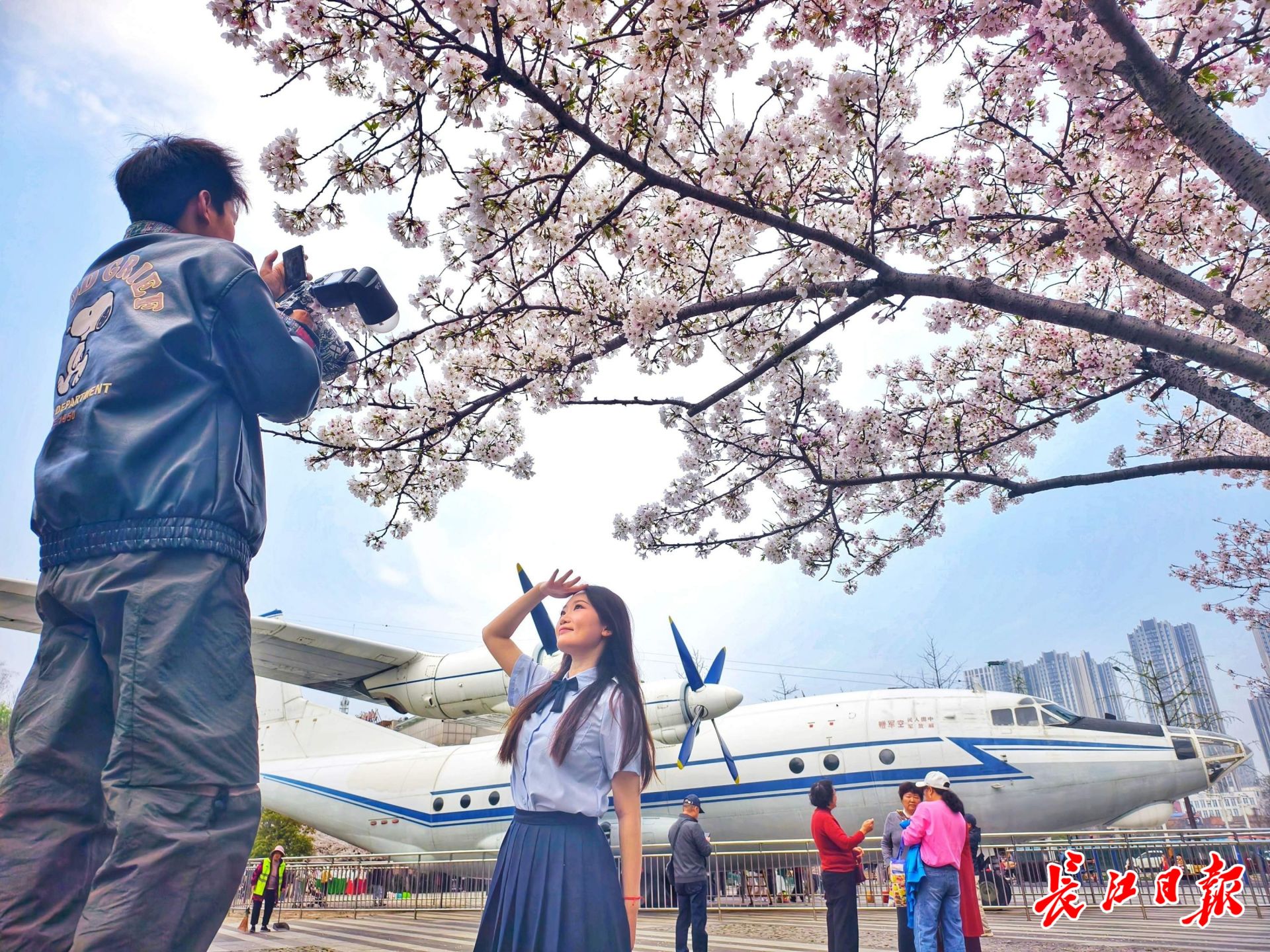 汉口王家墩公园,市民游客在樱花掩映的飞机前拍照。 记者苗剑 摄