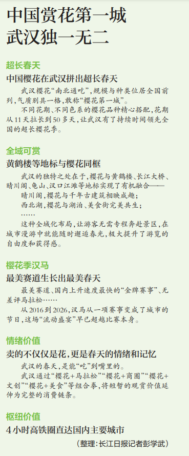 武汉赏花经济独特性在哪儿?4月10日,长江日报记者走访文旅专家、旅游博主、旅行社负责人及各地游客后发现,从“相约春天赏樱花”到人们心中“春天最好的样子”,武汉的持续走红,是一座城市对“春光经济”的深刻理解与成功实践——最好的春天,就在满城花开、生机勃勃的城市生活里。