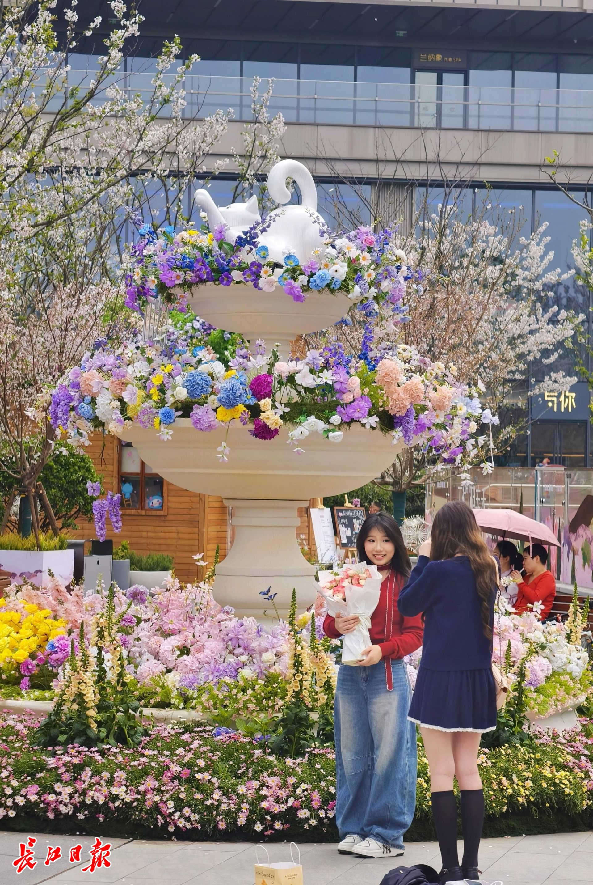 武昌滨江天街将油画中的花园搬进城市商圈,市民在莫奈花园风喷泉间逛街赏游,春日浪漫扑面而来。 记者苗剑 摄
