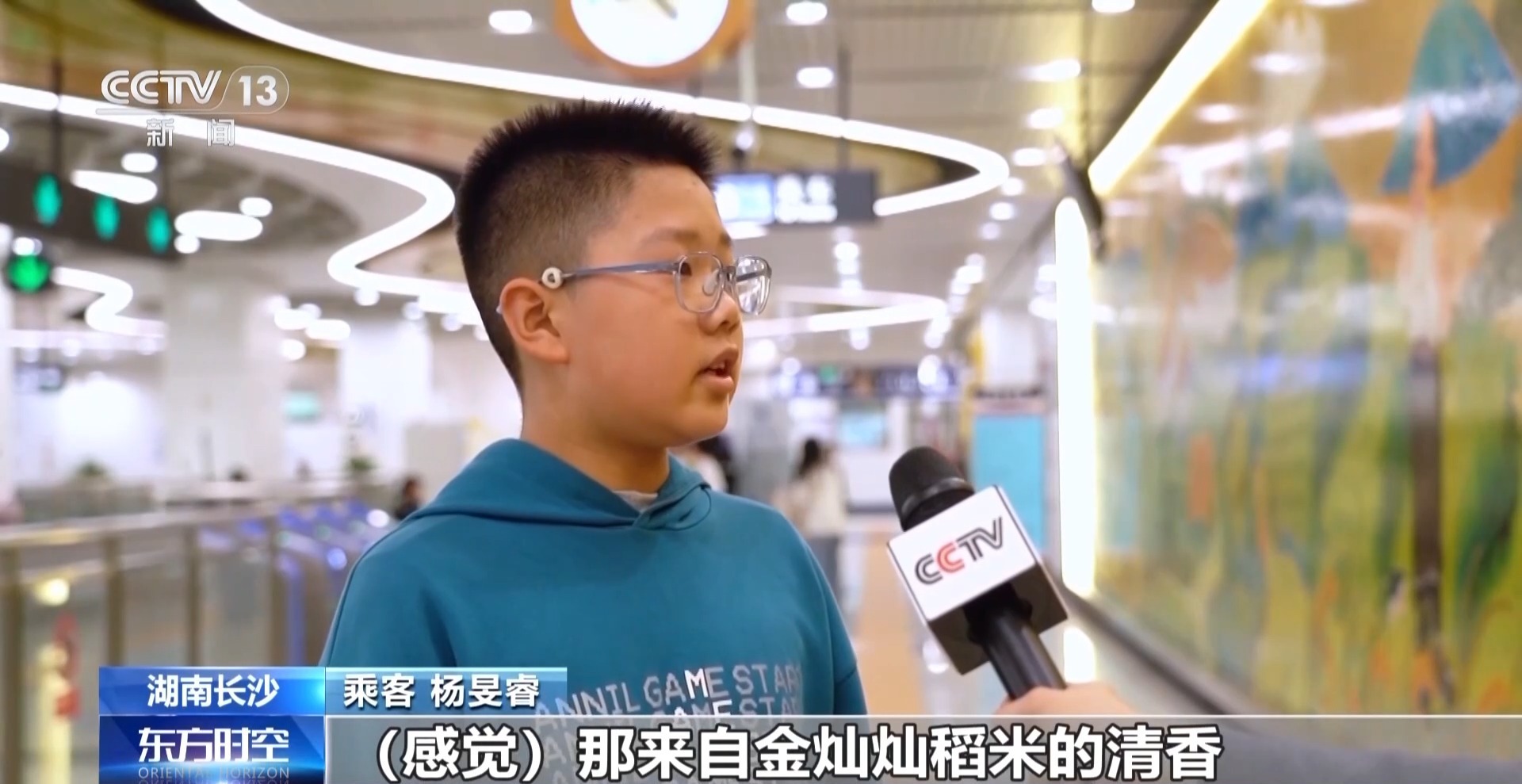 广州地铁设计院长沙分院副院长 陈勇军:首先,镂空的设计实际是展现了稻穗的形状;再看颜色,金黄色的渐变体现了稻谷逐渐成长到成熟的过程;再结合灯光设计,让人仿佛徜徉于金黄稻海之中。